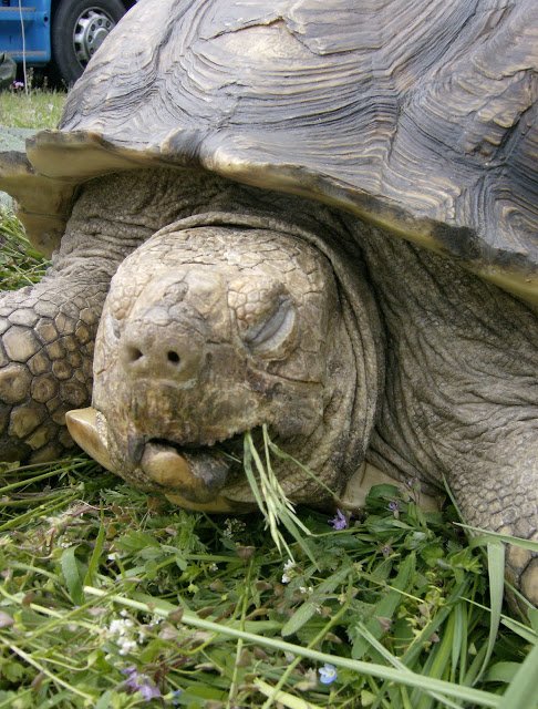 Egy óriás teknőst, aki mélán rágcsált egy kis csokor füvet, és próbált nem tudomást venni arról, hogy az arcába mászom a fényképezőgéppel.