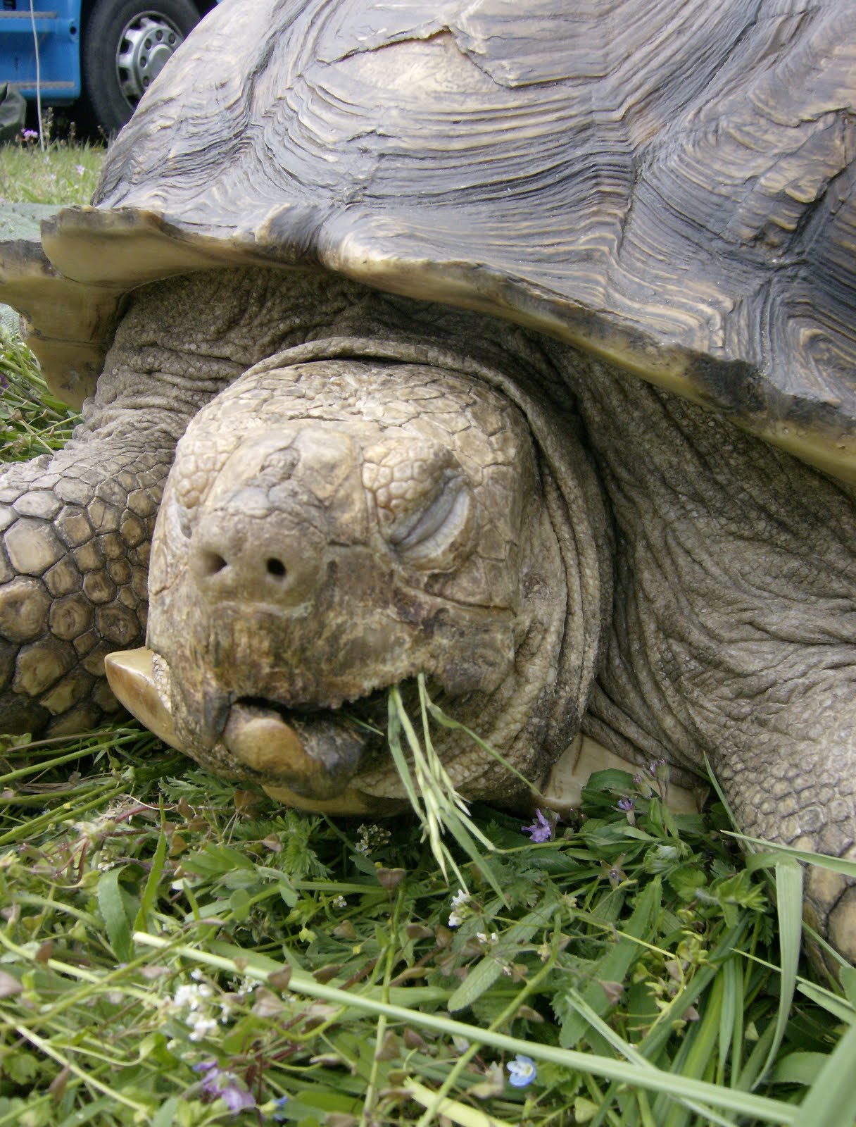 Egy óriás teknőst, aki mélán rágcsált egy kis csokor füvet, és próbált nem tudomást venni arról, hogy az arcába mászom a fényképezőgéppel.
