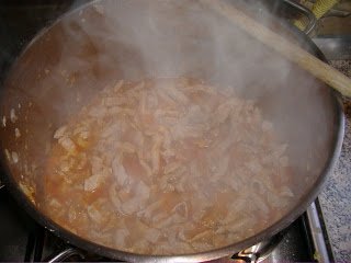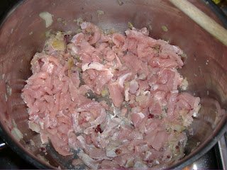Amikor a hagyma kicsit barnulni kezd, hozzáadjuk a húst, fehéredésig pirítjuk. Ekkor sózzuk, borsozzuk, megszórjuk a pirospaprikával, átkeverjük, és felöntjük annyi vízzel, amennyi majdnem ellepi.