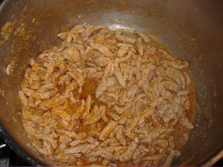 A húst (kb. 3 centi hosszú)csíkokra vágjuk.