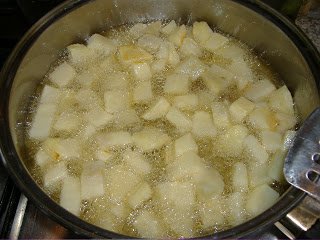 A krumplit meghámozzuk, és nem túl nagy (kb. 1,5×1,5 centis) kockákra vágjuk. Annyi vizet öntünk rá, amennyi ellepi, és ezt a sütés előtt fél órával öntjük csak le róla.