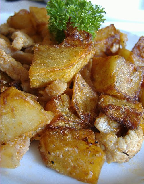 A megsült burgonyakockákat papírtörlővel bélelt tálba szedjük, hogy feligya a felesleges olajat, és amikor az összes krumplit megsütöttük, akkor összekeverjük az enyhén szaftos hússal. A krumpli beszívja a fokhagymás levet, és fantasztikus íze lesz.