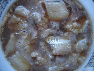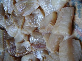 Egy serpenyőben bő olajat hevítünk (optimális esetben olívaolajat), a halkockákat megmártjuk a lisztes masszában, és kisütjük.