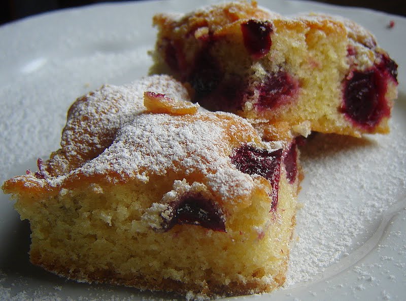 3. Keverjük hozzá a lágy vajat (lágy legyen, tényleg!), a lisztet és a sütőport, öntsük sütőpapírral borított közepes tepsibe (az enyém 30×28-as), szórjuk rá a cseresznyét, és süssük 30-35 percig.