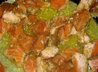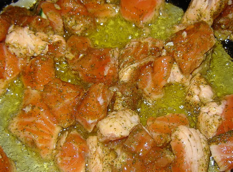 Kockára vágtam a lazacfilét, beszórtam a fűszerkeverékkel, és pár perc alatt olívaolajban megsütöttem.