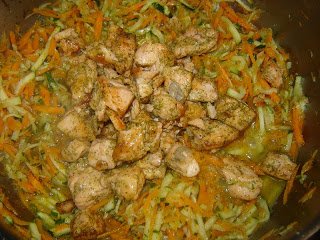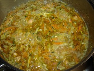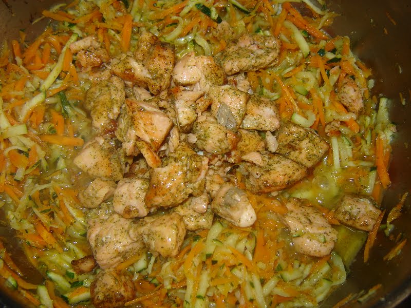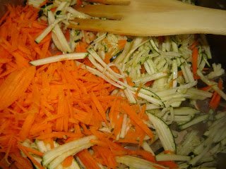 A cukkinit megmostam, a répát megpucoltam, és mindkettőt legyalultam a képen látható módon. Kevés olívaolajon átforrósítottam, megsóztam, annyi vizet öntöttem alá, amennyi épp ellepte, és amíg főtt, megsütöttem a halat.