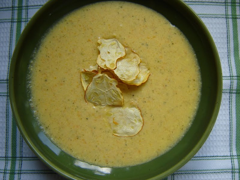 A cukkiniből gyalun vékony szeleteket vágtam, sütőpapírral borított tepsibe tettem, és amíg a leves főtt, 100 fokos sütőben szárítottam. Ropogós lett, de végül az egész intézkedés feleslegesnek bizonyult: ahogy rátettem a levesre, a cukkiniszeletek visszaszívták magukba a vizet, és puhák lettek. Szóval, ez nem jött be.