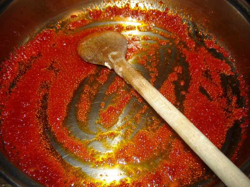 Közben folyamatosan kevergetjük, nehogy megégjen, mert akkor a szaftunk keserű lesz. Nem kapkodjuk el a dolgot, mert nem paradicsomlevest akarunk, hanem azt a karamellizálódott ízt szeretnénk elérni; amikor látjuk, hogy barnul a püré, akkor, de csak akkor megszórjuk a liszttel, gyorsan elkeverjük, és felöntjük kb. 4 dl vízzel.