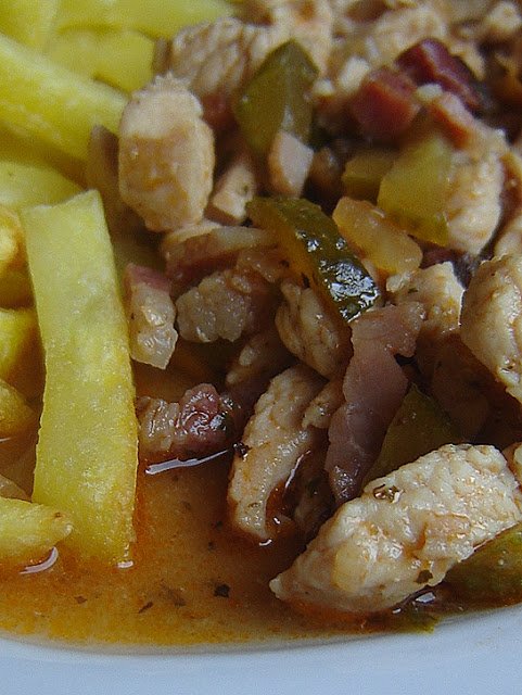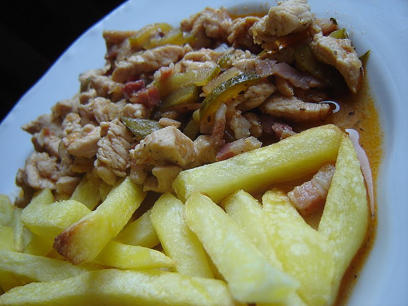 A szalonnaszeleteket felcsíkozzuk; amúgy, a tokánynál általában mindent csíkozunk.