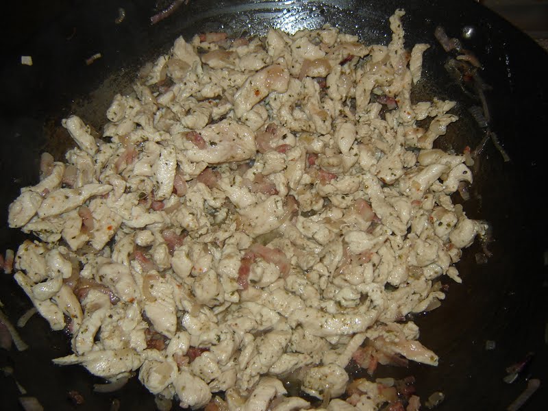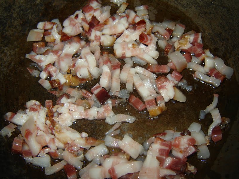 Wokban, vagy valami mély serpenyőben elkezdjük kiolvasztani a szalonna zsírját.