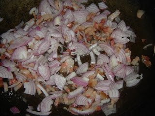 Amint felvágtuk a húst, a hagymás szalonnához adjuk, és pirítani kezdjük. Sózzuk, borsozzuk, belenyomjuk a fokhagymát, hagyjuk, hogy levet eresszen, majd el is fője azt, és közben elkészítjük a szaftot.