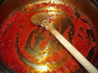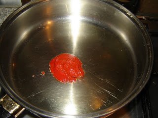 Egy másik serpenyőben, vagy kisebb lábasban olajat melegítünk, annyit, amennyi szépen szétterül az edény alján, majd beletesszük a paradicsompürét, és pirítani kezdjük.