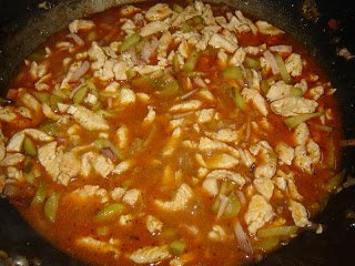 A húst időközben kissé le is pirítottuk, és ekkor ráöntjük a szaftot. Gyorsan csíkokra vágjuk a sonkát, a raguba tesszük, majd felcsíkozzuk az uborkát, ez megy bele utoljára.