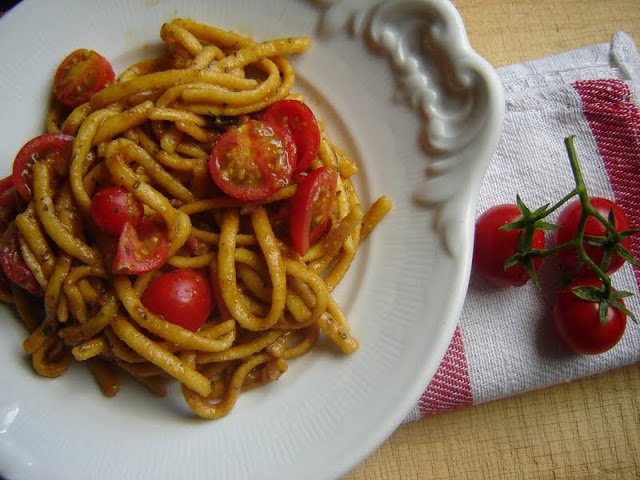 Itthon spagetti helyett találtam a szekrényben egy zacskó eierspätzle nevű tésztát, ami hasonló a mi gyufatésztánkhoz, csak kicsit vastagabb és hosszabb; durumdarával készült. Ezt főztem meg.