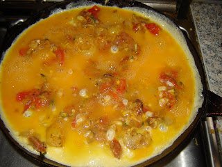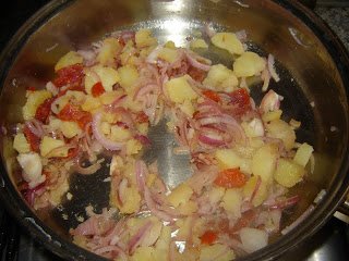 Na, de itt egy kis előzmény: lepirítjuk a szalonnát, rá a hagymát, összevágott kaliforniai paprikát, paradicsomot, mehet bele cukkini, chorizo kolbász (mondjuk) és sütjük; amikor átsült, hozzáadjuk az olajban külön kisütött krumplit.