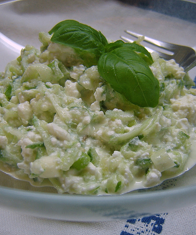 Az uborkát megmostam, lereszeltem a nagylyukú reszelőn. Apróra vágtam a zöldhagymát, a fokhagymagerezdeket, és az uborkához adtam. Mozsárban pépesítettem a szardellát, egy kis joghurttal keverve ment a többihez. Belekevertem a túrót és a joghurtot, sóztam, borsoztam. (Sóból nem kellett sok, mert a szardella jó sós.)