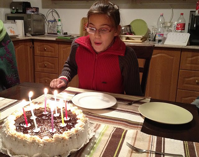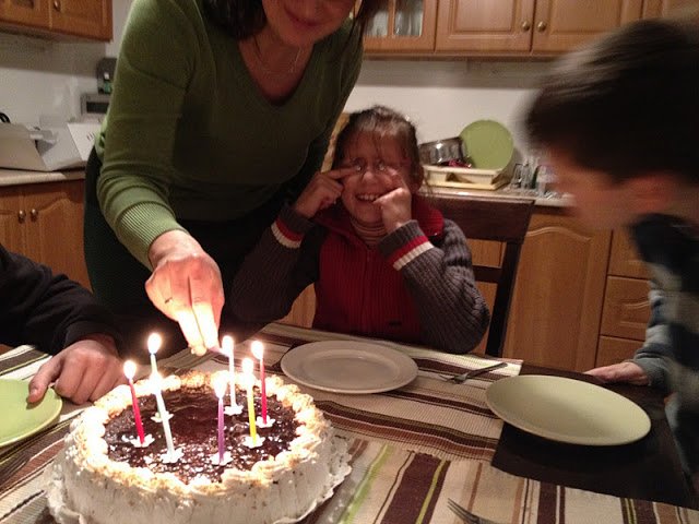 | Itt még Zsófi befogta a szemét, hogy meglepetés legyen neki a torta. |