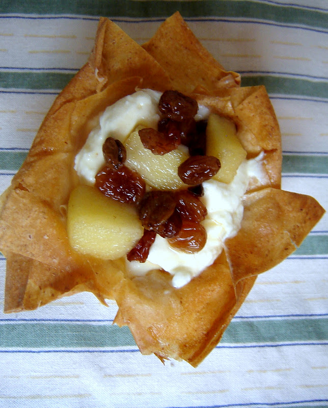 A kihűlt kosarakban elosztottam a mascarponés krémet, majd hűvös helyre tettem tálalásig. Csak tálalás előtt tettem rájuk a mazsolából és az almából, illetve meglocsoltam a fehérboros lével. Azért csak tálalás előtt, mert különben eláztak volna a kosarak.