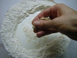 A lisztet tálba tettem, közepében mélyedést alakítottam ki. Beleöntöttem a langyos tejet (előtte elkevertem benne 2 tk cukrot), és belemorzsoltam az élesztőt.