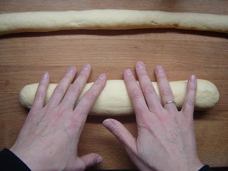 A megkelt tésztát aztán két darabba szedtem, mindkettőt gombóccá gyúrtam, majd tíz perc pihentetés után hosszú kígyókat sodortam belőlük. Úgy 70 centiseket. Ezeket aztán középen összecsíptem, így kaptam négy szálat.
