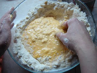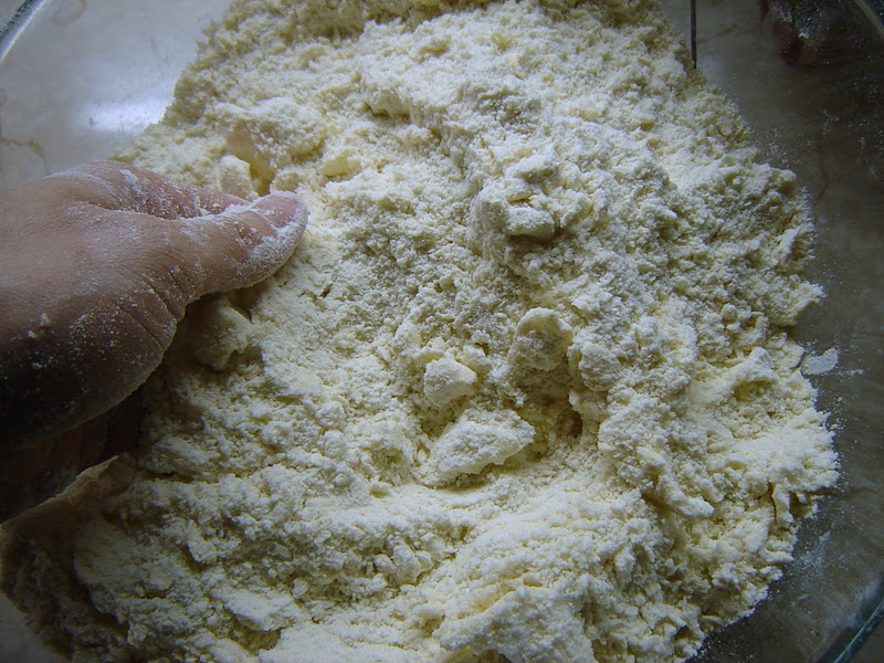 Egy nagy tálba szitálom a lisztet, elkeverem benne a sót, majd beledobom a vajat, és a két tenyerem között elmorzsolom a liszttel, amíg nagyjából homogén szerkezetű nem lesz.