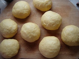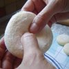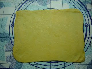Amikor a töltelékek már nem forróak, előveszem a tésztagombócokat. Fogom az elsőt, és 20×25 cm-es téglalapra nyújtom.