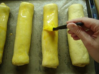 Lekenem 1 tojás+ 1 tojássárga keverékével, és hagyom rászáradni. Amikor megszáradt, a fehérjével külön lekenem, és ezt is hagyom megszáradni. Közben előmelegítem a sütőt 200 fokosra.