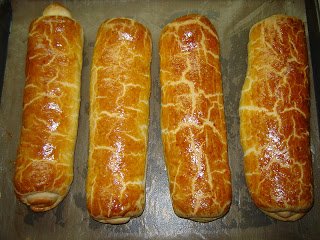 Ilyen csinos kis rudakat kapunk. A többi gombócot is megtöltöm a maradék töltelékekkel, és szépen egymás mellé sorakoztatom a csinos kis hengereket egy sütőpapírral borított tepsiben. Nem túl közelre, mert különben összeérnek.