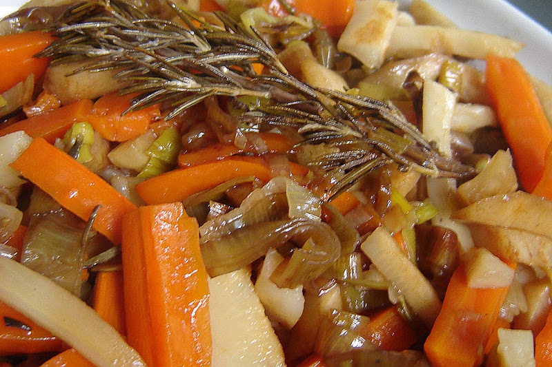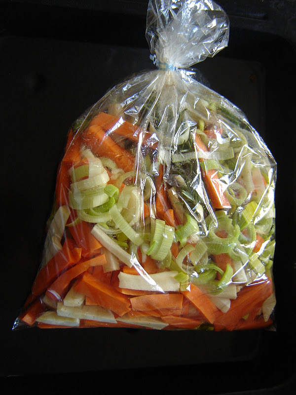 A gyökereket megtisztítjuk tetszés szerinti hasábokra vágjuk. Csak lazán, szabadon. A póréhagymáról levágjuk a szétágazó leveleket, hosszában félbevágjuk, és kimossuk a levelek közül az esetlegesen ott levő port, földet. Az összes hozzávalót a sütőzacskóba tesszük, a balzsamecettel, az olívaolajjal és a fűszerekkel együtt. Lezárjuk a zacsit, megpróbáljuk benne eloszlatni a balzsamecetet meg az olajat, amennyire lehet. A zacskóra vágunk egy kis lyukat a nyakánál, hogy azért a felesleges gőzök távozhassanak, és mehet a sűtőbe, egy tepsin.