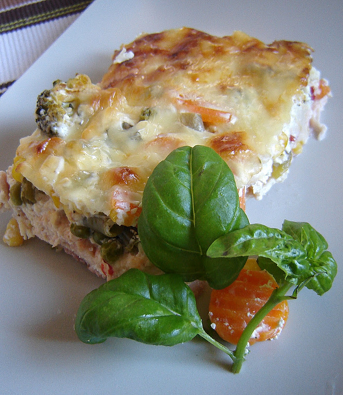 A tejfölt összekevertem 1 ek sóval, 1 kk borssal, és 1 tk oregánóval, majd eloszlattam a zöldségen. Végül sajtot reszeltem rá, és már ment is a sütőbe. 1 óra alatt sült szép pirosra.
