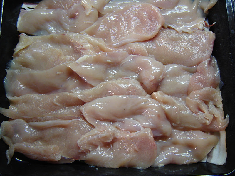 Először a csirkemellet felszeleteljük, majd a sütőt előmelegítjük 190 fokosra.