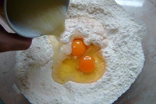 A lisztet tálba tesszük, mélyedést alakítunk ki a közepében. Beleöntjük a langyos tejet, a cukorból teszünk hozzá egy teáskanálnyit, és belemorzsoljuk az élesztőt. Amikor felhabosodott, hozzáadunk először csak két tojást, a maradék cukrot, az olvasztott vajat, a sót, és alaposan összekeverjük.