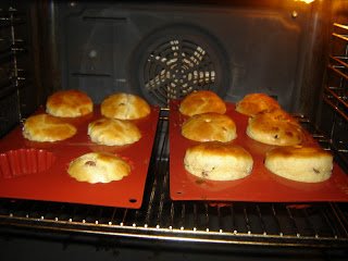 A megkelt tésztát átkeverjük, elosztjuk a formákban. Látjátok, hogy a 12. mélyedésbe nekem nem jutott, az a helyzet, hogy a jobboldali formát kicsit túltöltöttem, nem gondoltam volna, hogy még mennyire meg fog kelni.