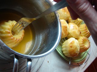 A kész süteményeket szedjük rácsra, a rács alá tegyünk egy tányért, majd egyenként fürdessük meg a szirupban a tésztákat. Tegyük vissza a rácsra.