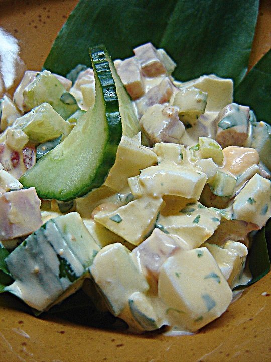 A hozzávalókat kis kockákra vágjuk, pontosabban az újhagymát vékonyan felkarikázzuk, a medvehagymát pedig felaprítjuk. Egy nagy tálba halmozzuk az összes hozzávalót, a majonézt összekeverjük a tejföllel, sóval, borssal, citromlével ízesítjük, és jól összeforgatjuk a hozzávalókkal.
