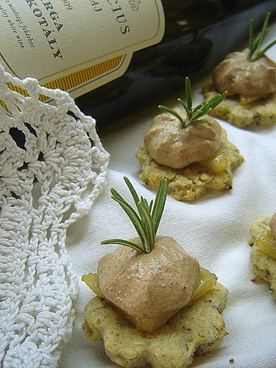 1 keksz, 1 körtedarab, habzsákból egy kis adag csirkemájhab, a tetejére rozmaring.