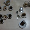 A képen láthatjátok az egyik versenyzőt, amint éppen tejet tölt a pohárba, vele szemben az érzékszervi zsűri feszülten figyeli minden mozdulatát, a másik két fehér inges a technikai zsűri, ők a munkafolyamat precizitását, tisztaságát tartották szemmel: a kávégépnek folyamatosan tisztának kellett lennie, sehol nem lehetett szétszóródott őrlemény, nem lehetett ujjlenyomat semmin, még a shakeren sem.