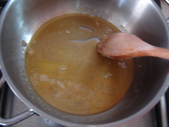 Karamellizáljuk a 6 ek cukrot, majd adjuk hozzá a vajat, és apránként a tejet.