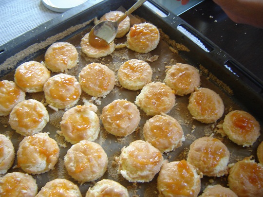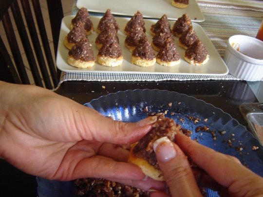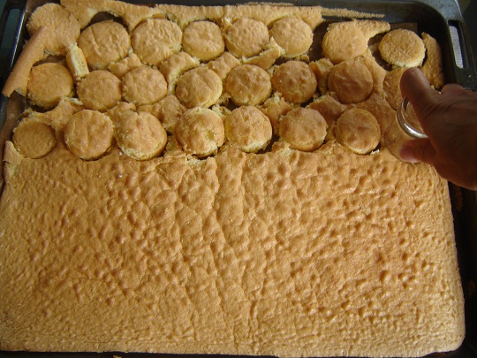 Piskótalapot sütünk a piskótatekercsnél leírt módon, de nem tekerjük fel. Amikor kihűlt, kiszaggatjuk egy 3-4 cm átmérőjű pohárral vagy pogácsaszaggatóval. 40-nél ne akarjunk többet. Elég lesz az. A maradék piskótadarabokat egy tálba szedjük, az megy a töltelékbe.