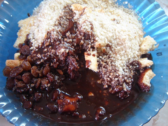 Tegyük egy tálba a maradék piskótát, az aprított aszalt gyümölcsöket, a darált mandulát és ezt a karamelles-kakaós keveréket. Keverjük jól össze.