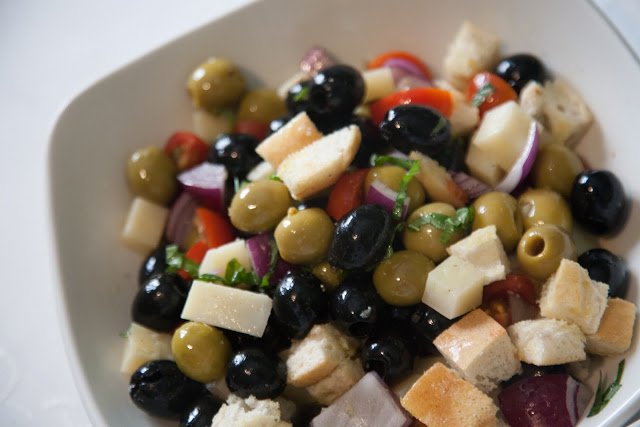 A fenti képen is egy nagyon klassz és egyszerű tapa-t láthattok: zöld és fekete olívabogyó, lila hagyma, zöldhagyma, kecskesajt, pirított kenyérkocka. Mehet rá kis citromlé, balzsamecet ízlés szerint.