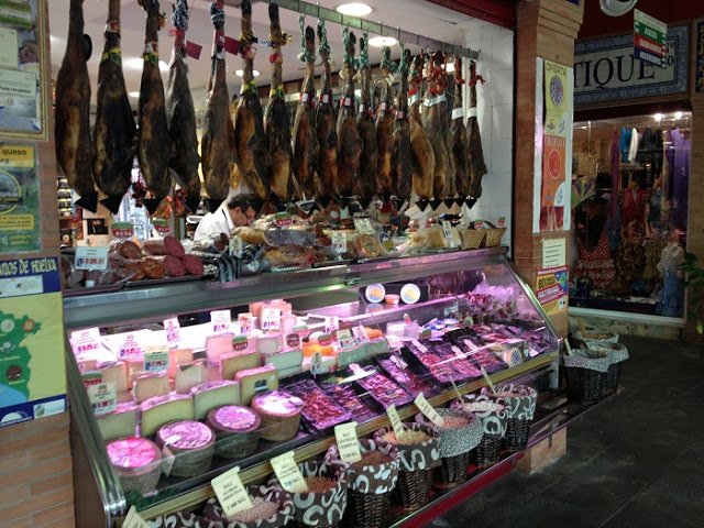 Sok helyen lógnak hasonlóképpen a sonkák, egyébként a tapasbárokban is, mindegyik aljába bele van szúrva egy-egy csúcsos, kúp alakú edényke, abba folyik ki a sonkalé. De megvehetjük a sonkát szeletelve is, persze, mellé számtalan, remek sajtot.