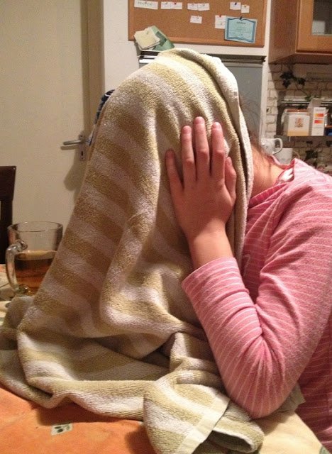 Csak ülök…és inhalálok/ inhalálok, inhalálok – énekeltem Zsófinak, aki nem ismerte ezt a dalt. Magát az inhalálást sem sokszor gyakoroltattuk vele, de nonszensznek éreztem, hogy a köhögésre egyből antibiotikumot adjunk, ezért felülbíráltam az orvos rendelkezését, és a gyógyszer helyett kamillás gőzölést iktattunk be naponta háromszor. Ezen kívül mindig sikerrel alkalmazzuk a Virágtól tanult mézes kakukkfűszirupot, de ugyanígy jó a lándzsás útifűszirup is (csak drágább).