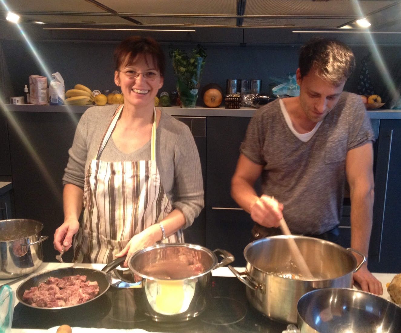 Alkalmanként ismerős, esetleg ismeretlen társaságnak főzünk vacsorát egy kedves kollégámmal; jelentős különbség kettőnk között, hogy én műkedvelő szakács vagyok (na jó, szakmám is, de a szakmai gyakorlatokon kívül soha nem dolgoztam nagy konyhán), ő pedig profi. Én találom ki a menüsort, segítséggel hozzáválogatom a borokat az ételekhez, ő pedig elképesztő koncentrációval dolgozik, főleg akkor, amikor már úgy érzem, kifutunk az időből.