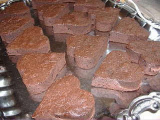 Kétféle sütit készítettem; az első olyasmi lett, mint a Segítsütire sütött Sacher-szívek, de más a tésztája, meg a tetején levő kis szívre került a piros marcipán – mert azt mondták, minimum rózsaszínnek, de inkább pirosnak kell lennie. Aztán az volt a kérés, hogy legyen magasabb. Hát magasabb lett.