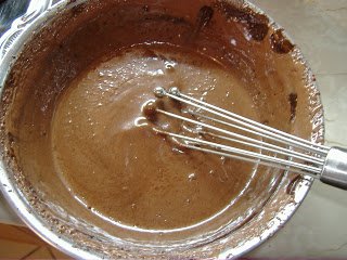 Amíg a tészta sül, készítsük el a krémet: gőz fölött addig keverjük a tojást a cukorral és a kakaóporral, amíg be nem sűrűsödik. Hagyjuk kihűlni.