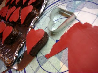 Kinyújtjuk a marcipánt, kivágjuk a szív formával,és a süti tetejére tesszük.