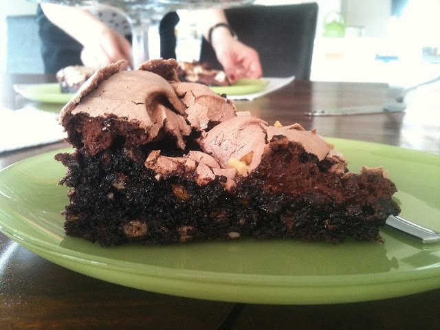 De itt ez a csokis-diós, ami szintén jó, úgy találtam egy blogon, ott olasz mogyorós csokitorta néven futott. Nekem azonban dióm volt itthon, azzal próbáltam ki, és maradtam is a diónál; bár aranyáron kapható ez is, de legalább folyamatosan beszerezhető. A torta pedig óriási.
