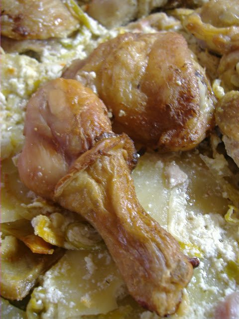 A tejet, a tejfölt és a tejszínt összekeverjük, keverünk ebbe is fűszereket bőven, és a krumplira locsoljuk. Ráhelyezzük a combokat, a tepsit beborítjuk alufóliába, és 200 fokon bő egy órán át sütjük (én eddig sütöttem, Max kevesebb ideig).
