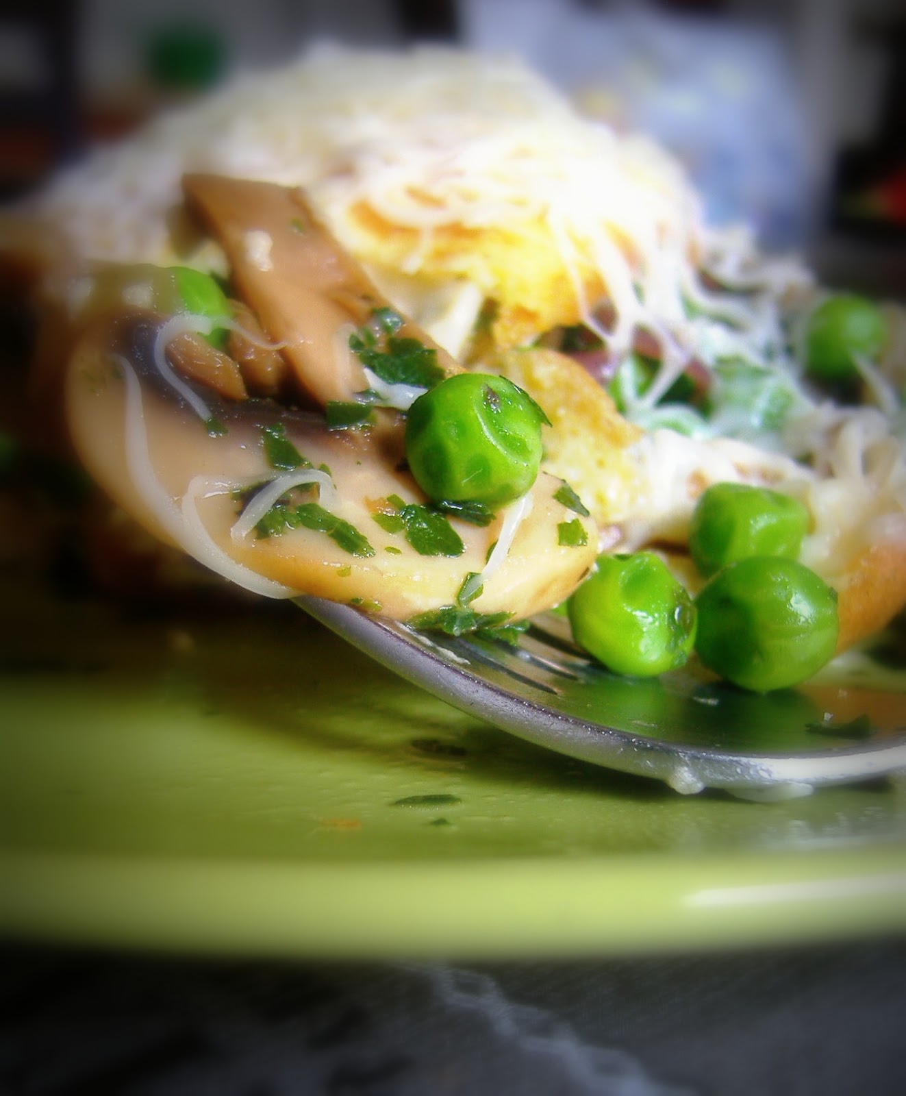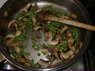 Kb. 5 dkg vajon megdinszteljük kissé a felszeletelt lila- vagy póréhagymát, rádobjuk a megmosott, szeletelt gombát, sózzuk, borsozzuk. Amikor a gomba leve elfőtt, hozzáadjuk a fagyasztott borsót, 2 percig még pároljuk, majd megszórjuk jó sok vágott petrezselyemmel, és elzárjuk alatta a lángot.